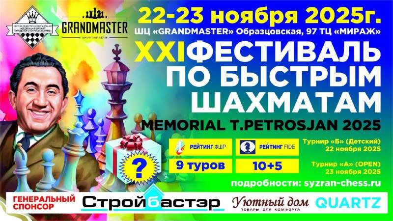 22 и 23 ноября в Сызрани (ШЦ "Grandmaster", ул. Образцовская, д.97, ТЦ "Мираж") состоится ХХI Фестиваль по быстрым шахматам, посвященный Тиграну Петросяну.